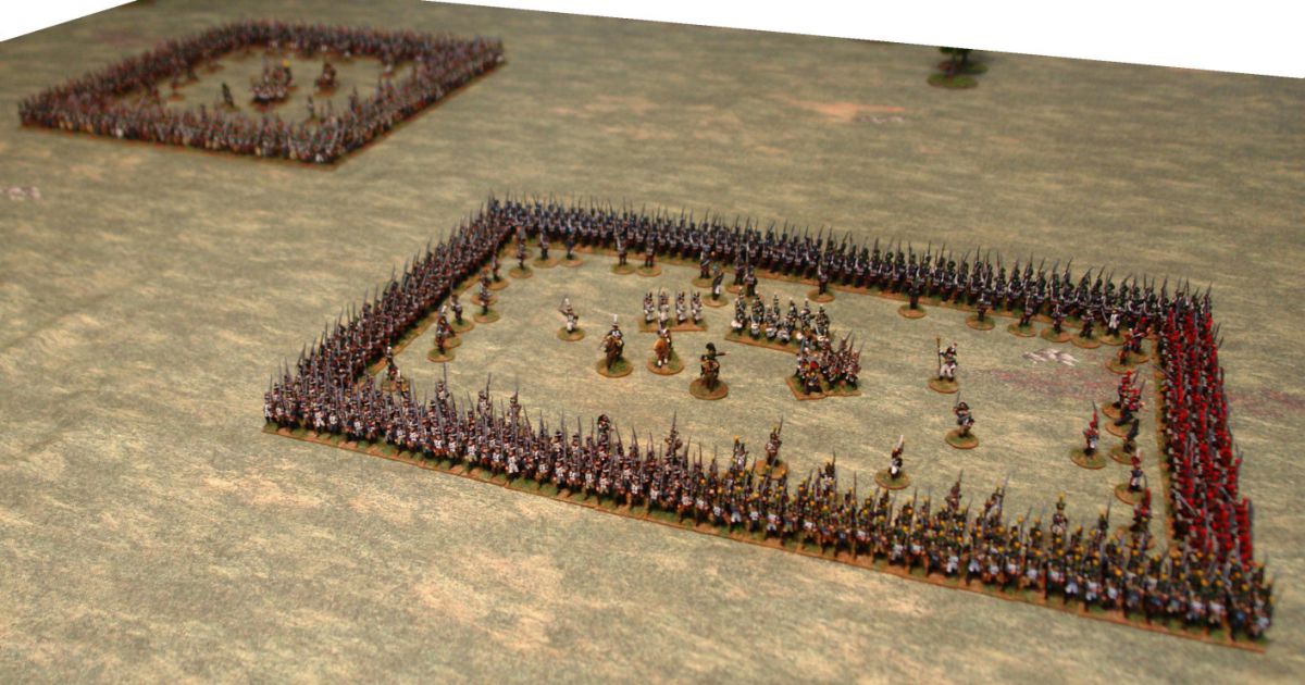 Le carré est l'une des formations les plus photogéniques, car il permet de visualiser l'ensemble des figurines sur une surface pas trop importante. Voici donc, pour le plaisir des yeux, notre bataillon rejoint par un bataillon de Voltigeurs de la Jeune Garde.