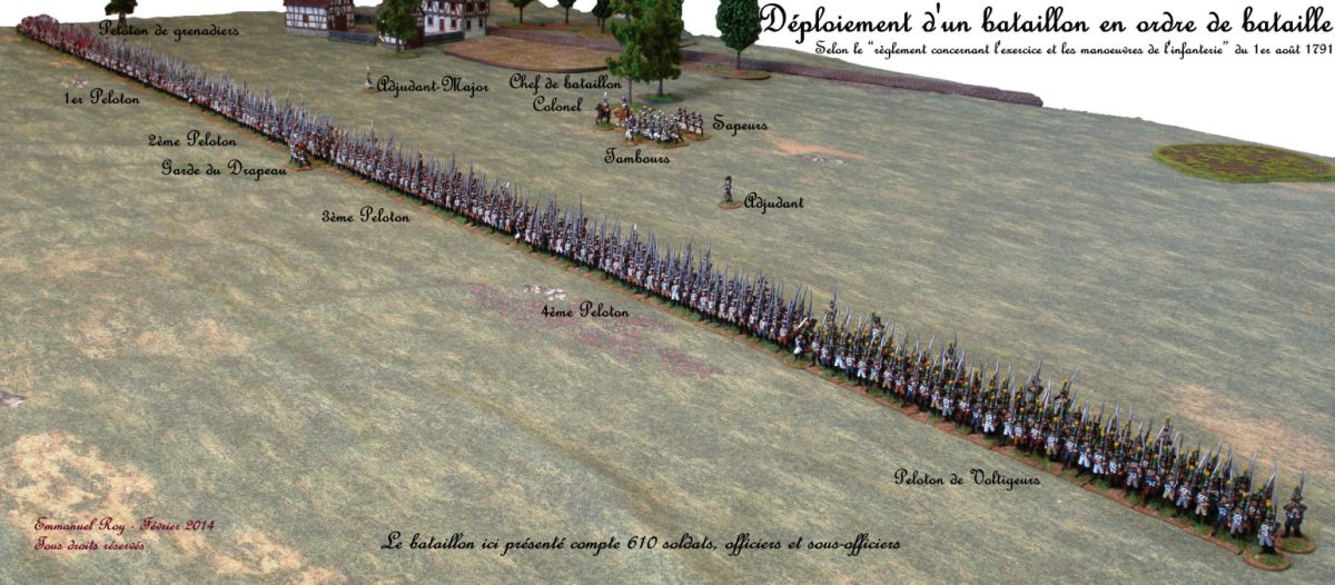 Le chef de bataillon se place à 20 pas derrière le centre du bataillon, les tambours à 15 pas derrière le centre du 2e peloton. Les adjudants se positionnent à 8 pas en arrière du centre de chacun des demi-bataillons.
