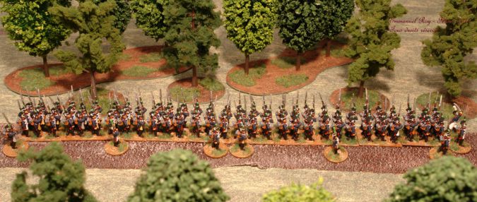 Ci-contre, un peloton en colonne par le flanc droit suit un sentier dans la forêt.